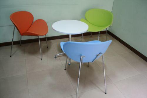 รายละเอียด: เก้าอี้กาแฟ โครงขาเหล็กชุป ที่นั่งและพนักพิงเป็นไม้ดัดหุ้มด้วย PVC มีสีฟ้า ส้ม เขียว สีเหลือง และ น้ำตาล
